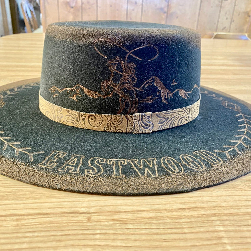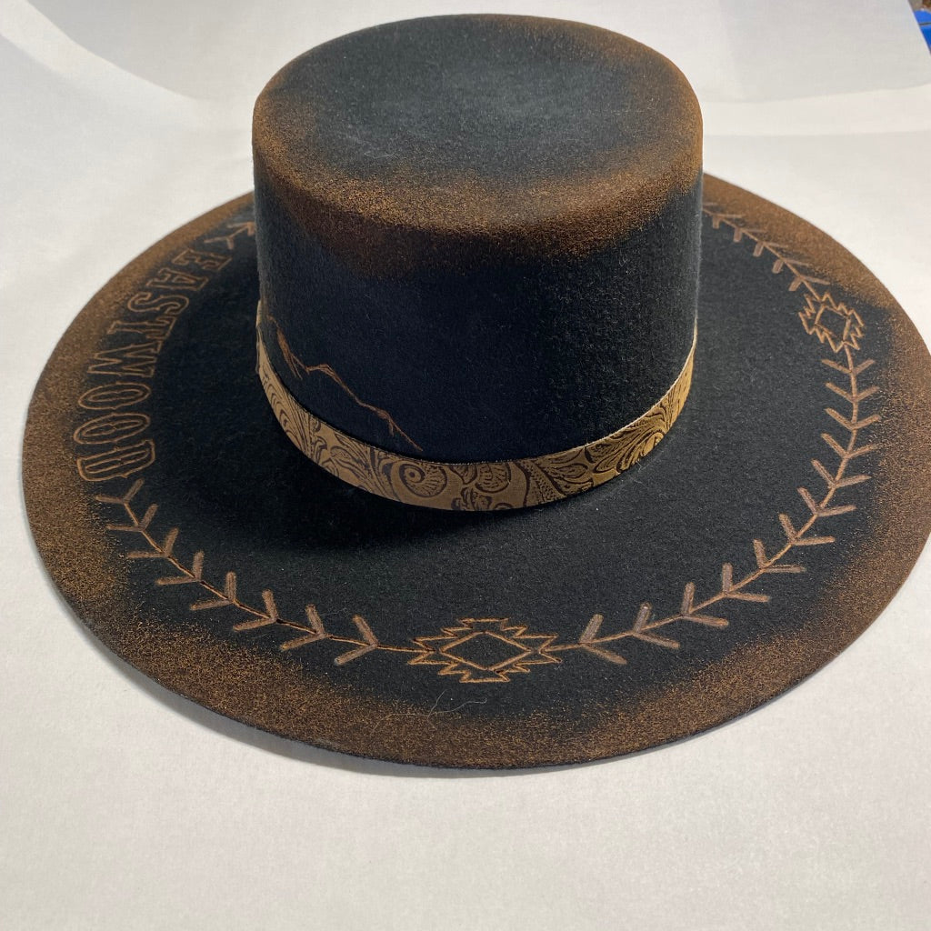 These unique hats are designed and hand burned by Cowgirl Spirit Creations. Hat band, feathers and any embellishments pictured are included. Feathers may be taken out for shipping purposes but can be secured by customer upon arrival. Hats are sealed twice to protect design and give some moisture protection. Air out hat upon arrival as it may still have a slight odor.