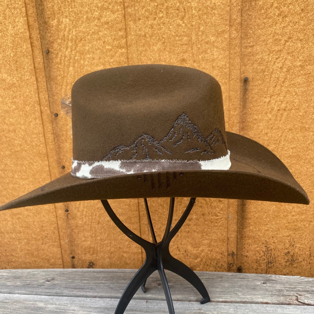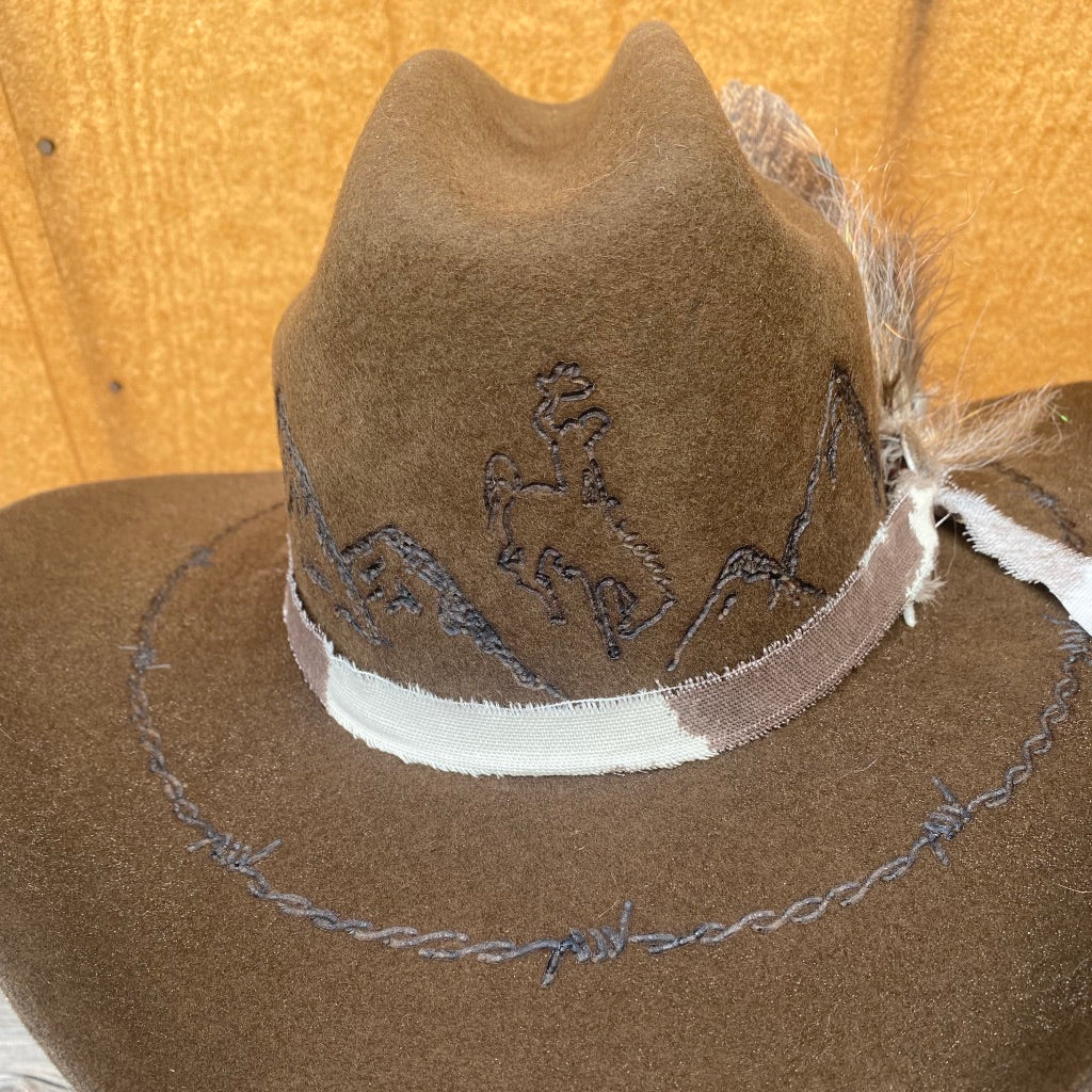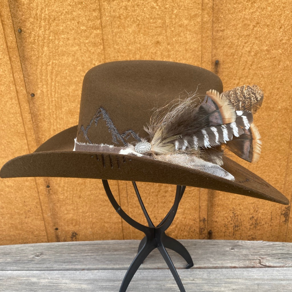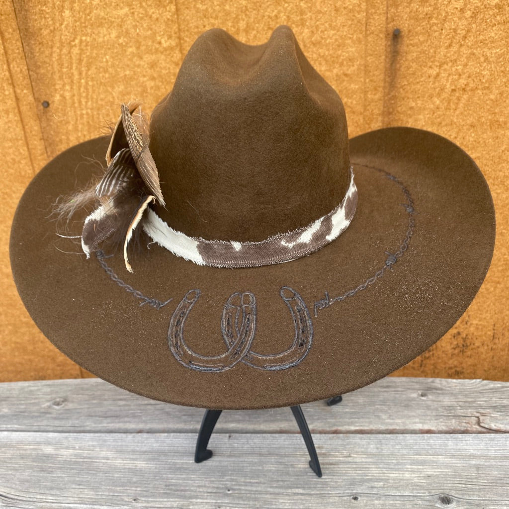These unique hats are designed and hand burned by Cowgirl Spirit Creations. Hat band, feathers and any embellishments pictured are included. Feathers may be taken out for shipping purposes but can be secured by customer upon arrival. Hats are sealed twice to protect design and give some moisture protection. Air out hat upon arrival as it may still have a slight odor.