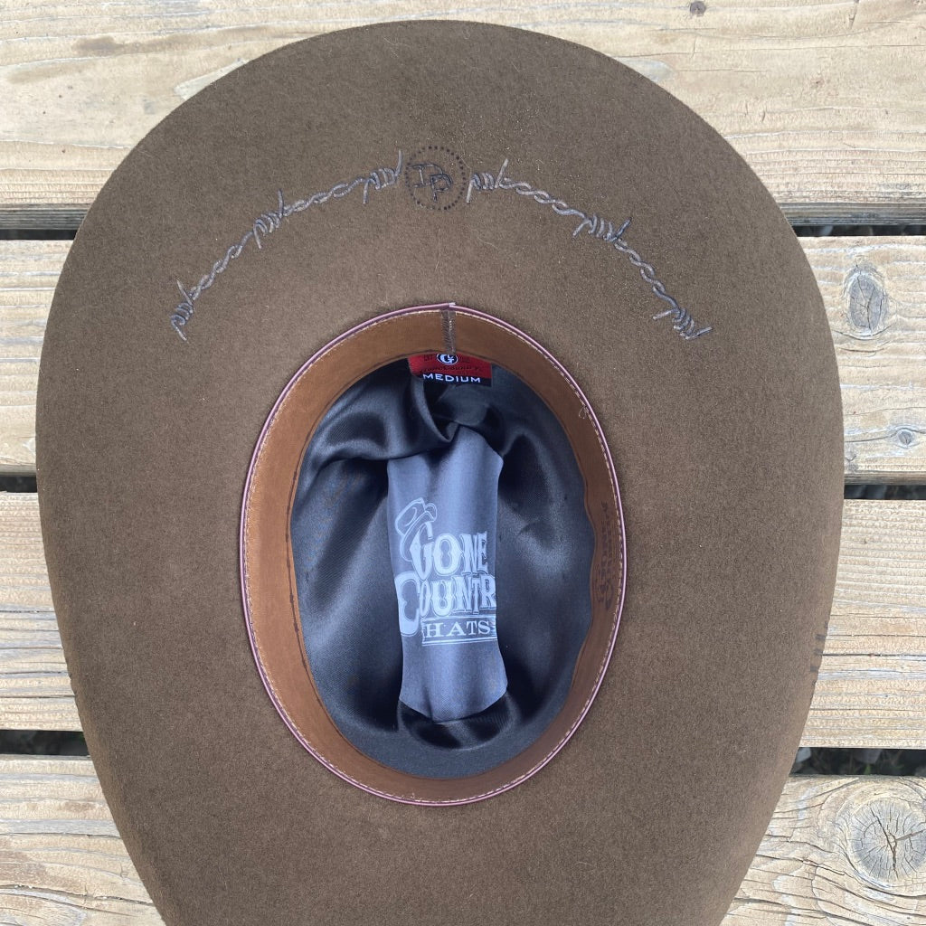 The officially licensed UW Bucking Horse and Rider grace the front crown of this brown colored Yellowstone style wool felt hat. This authentic style cowboy hat has barbed wire all around the brim that meets up with a pair of lucky horseshoes in the back . Hat also features a satin lining as well as an adjustable sweatband so one size fits most.