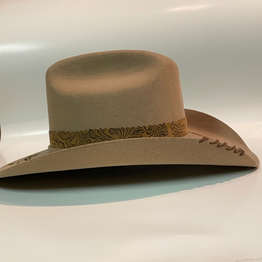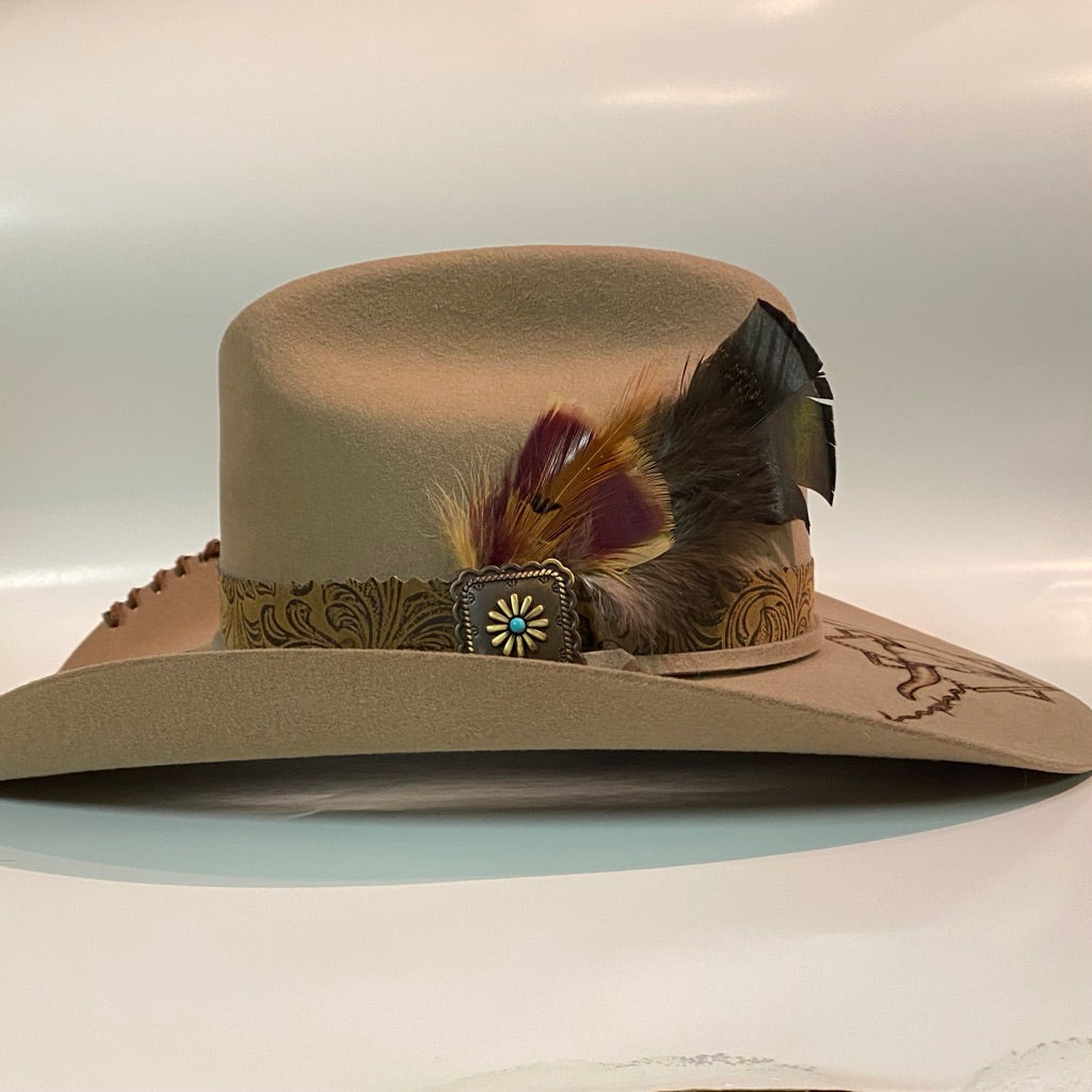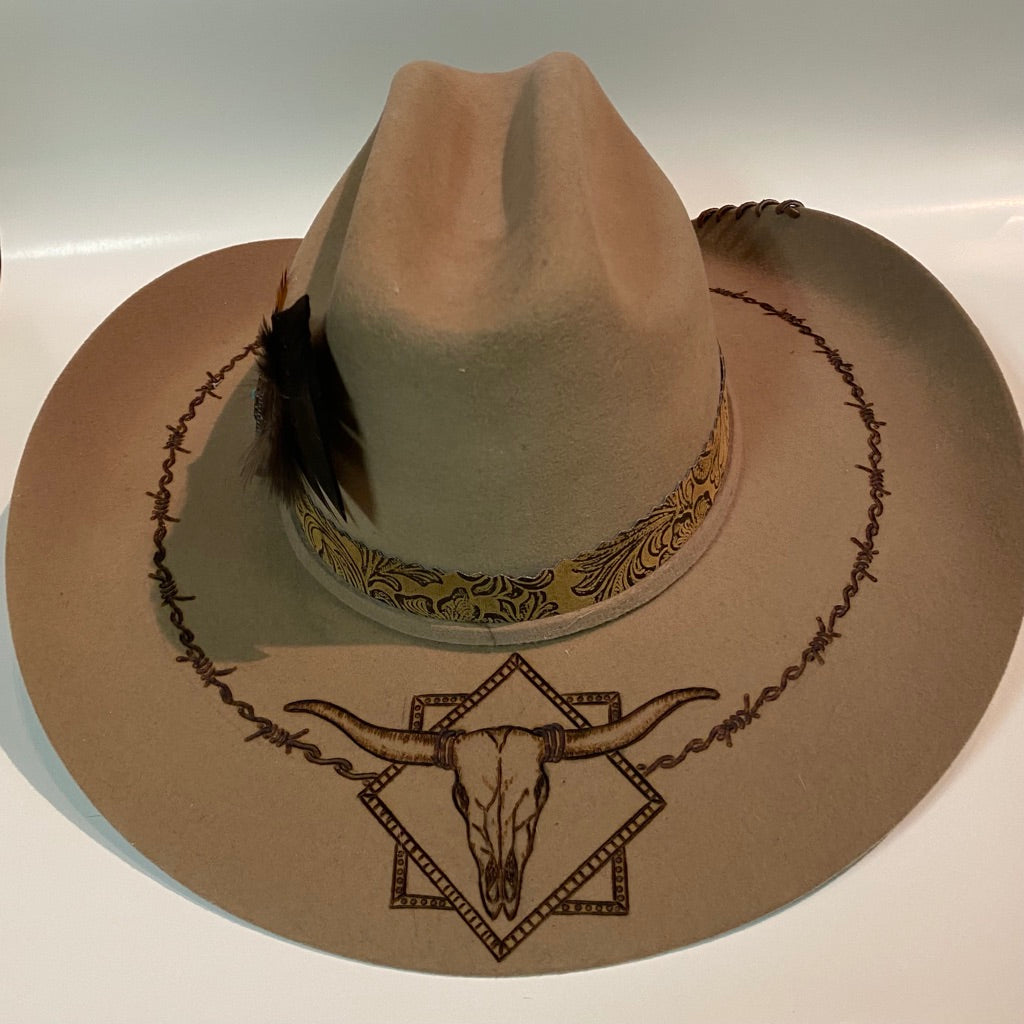 This custom burned hat was Christmas gift! It features a longhorn skull with barbed wire encircling the crown and real leather whipstitch on the brim.