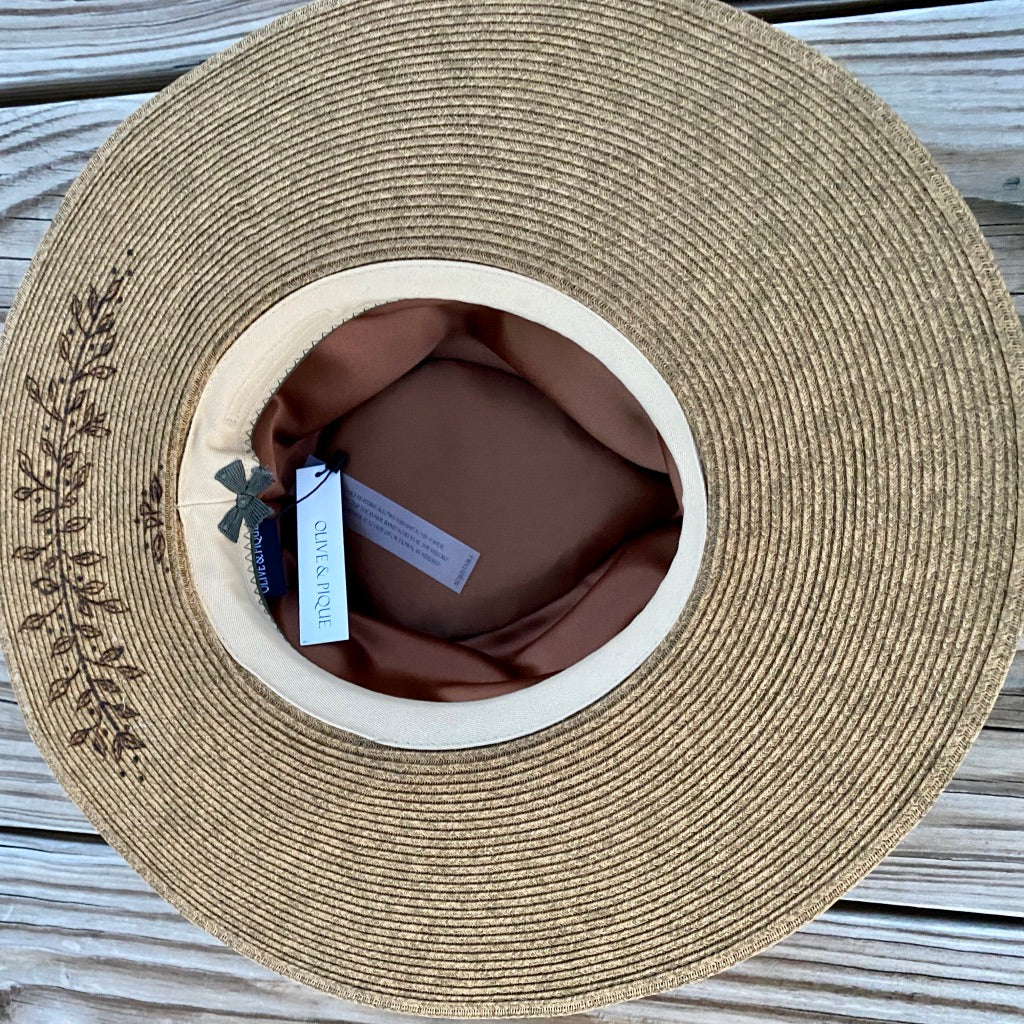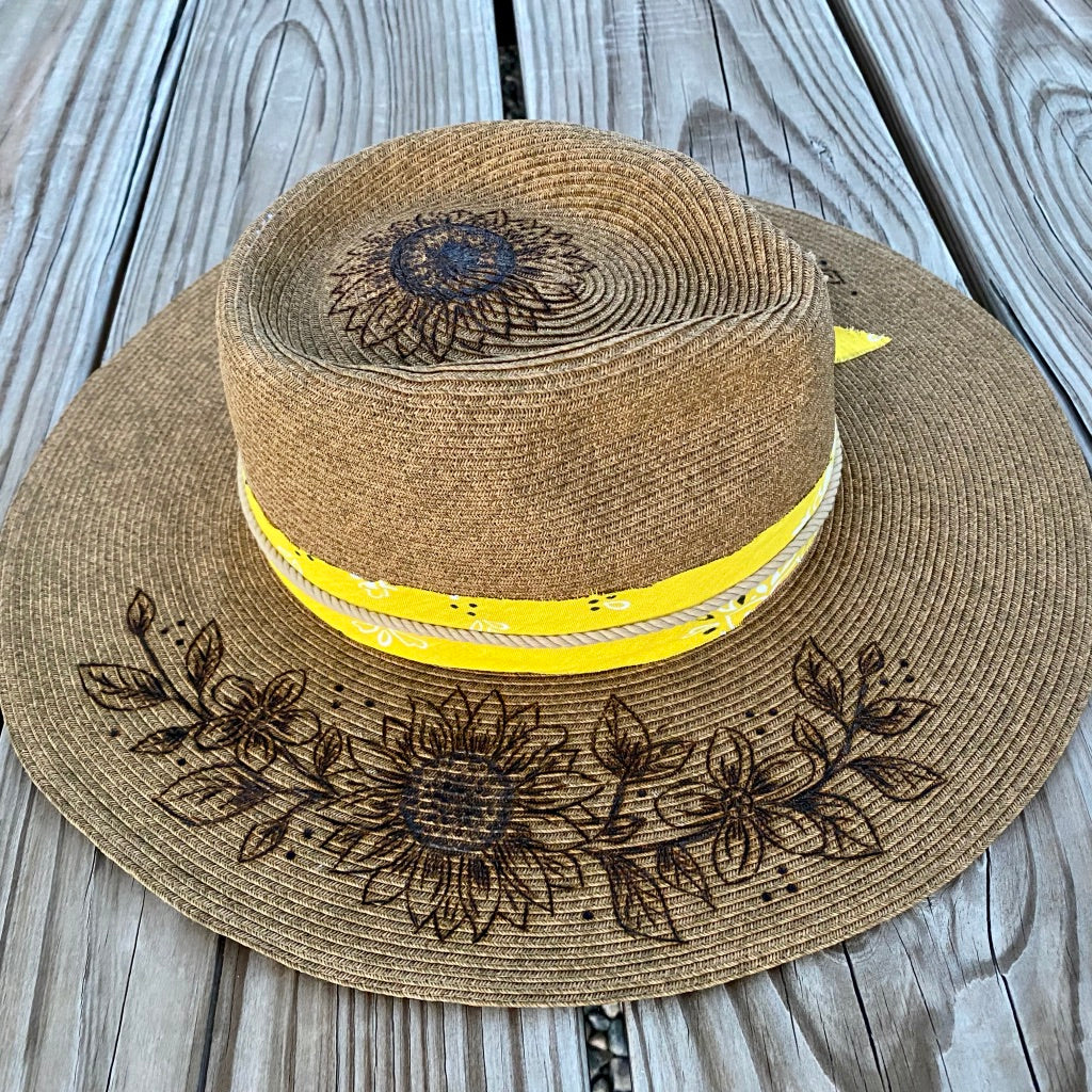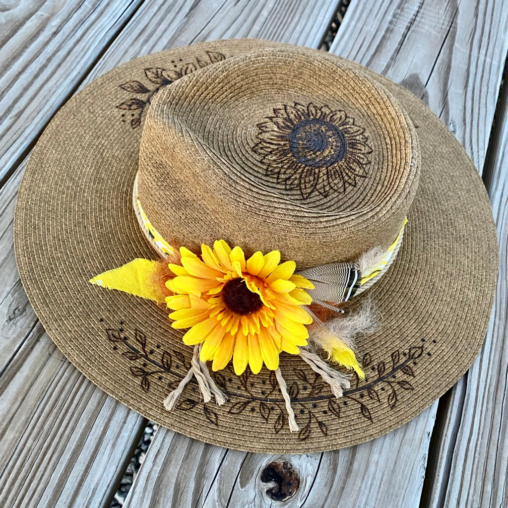 Bright and sunny sunflowers were the flower for this custom burned, palm, rancher style hat. The awesome lady that wears this hat wanted a beautiful hat she could wear in the summer while tending her garden.