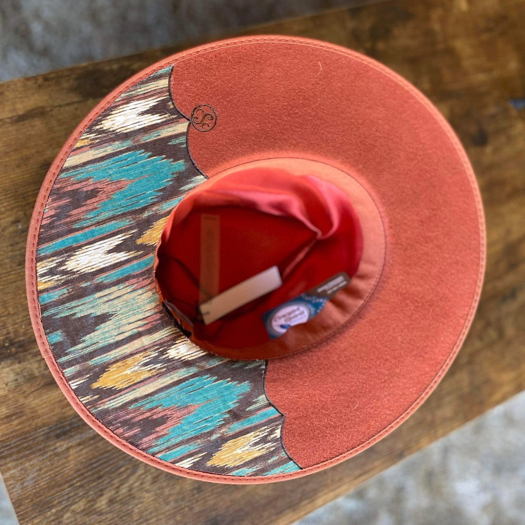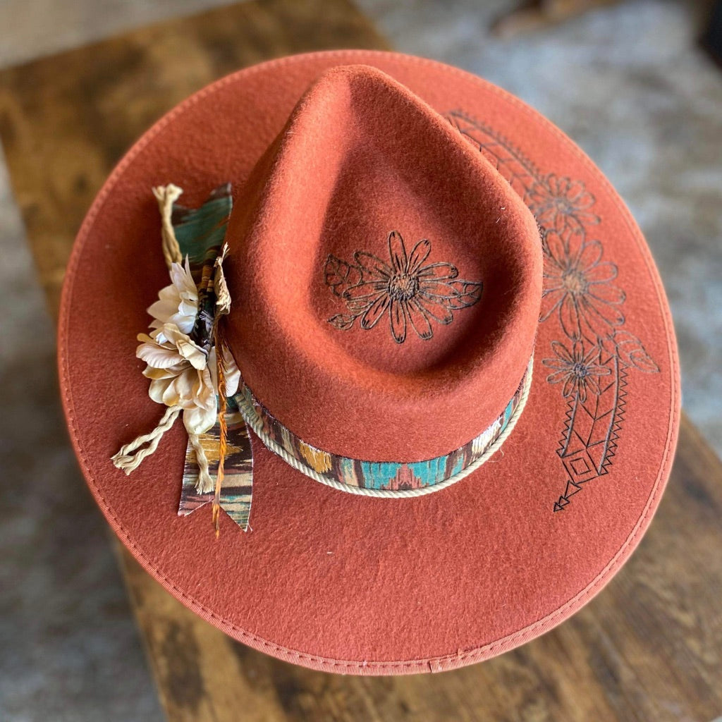 This custom burned hat was a live auction item at the Casper event. This rust colored rancher style wool felt hat featured daisy style flowers with a southwestern fabric on the underside for an awesome pop of color!