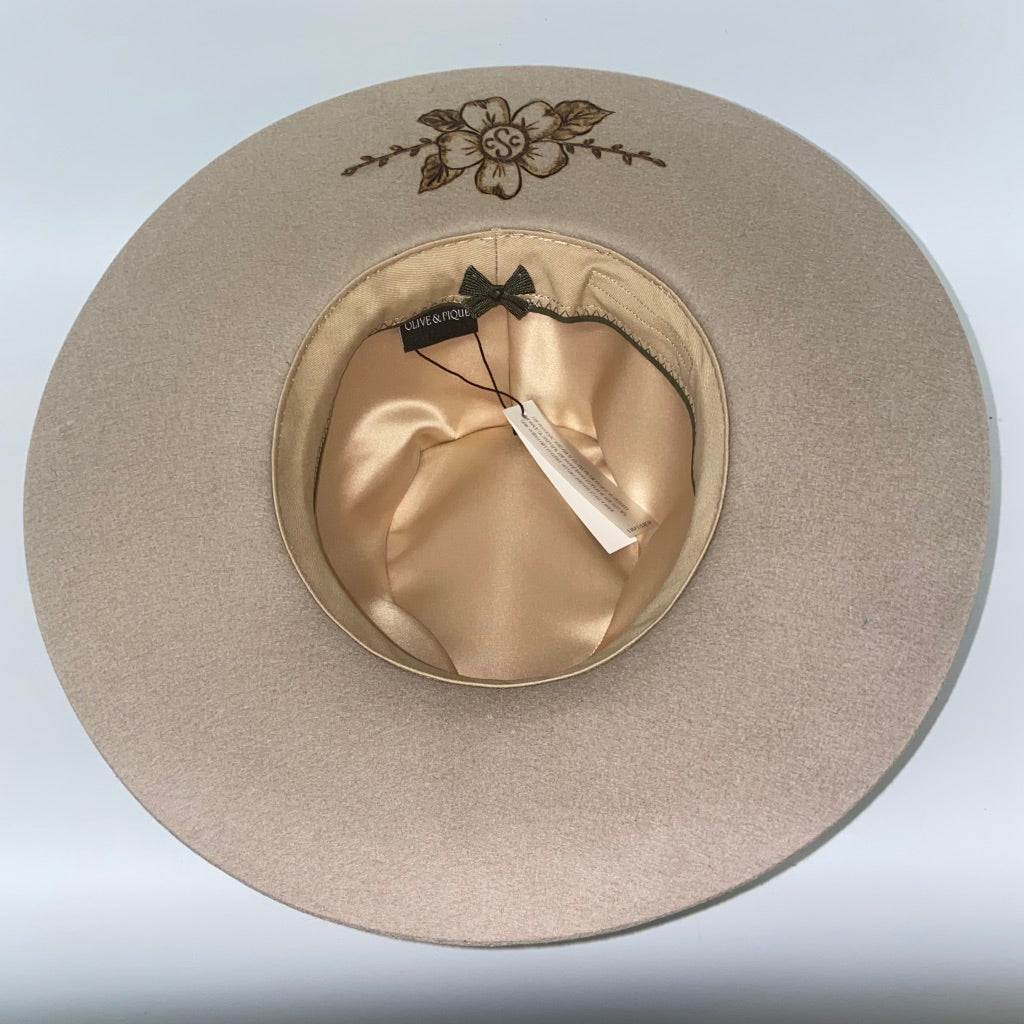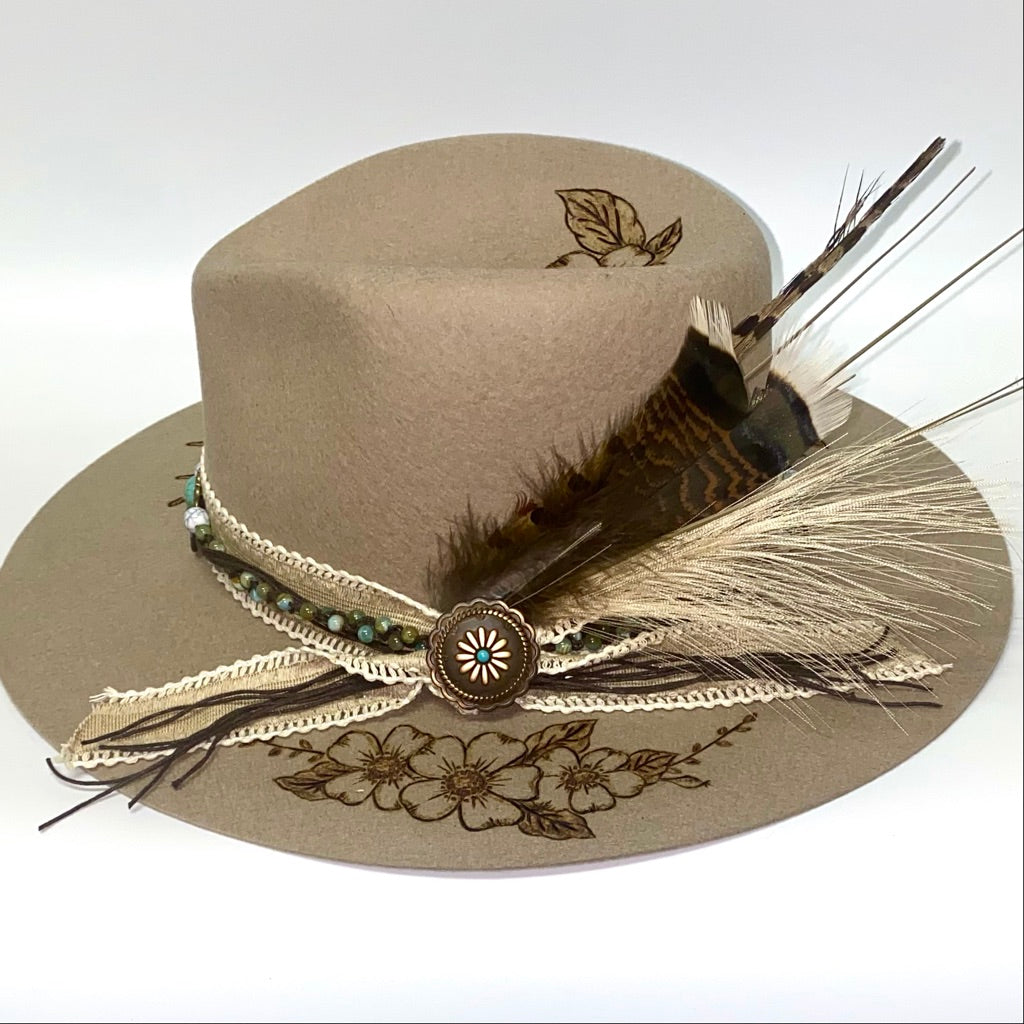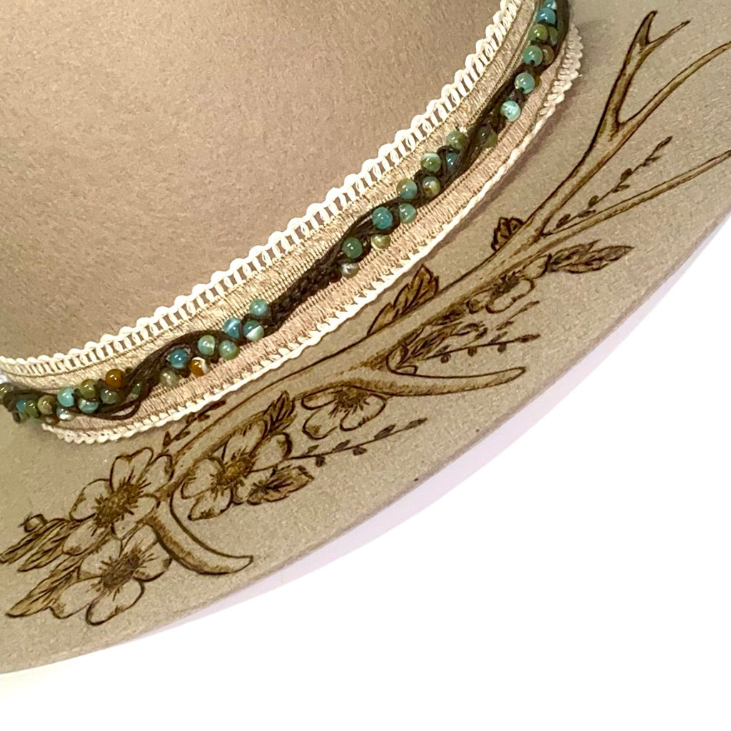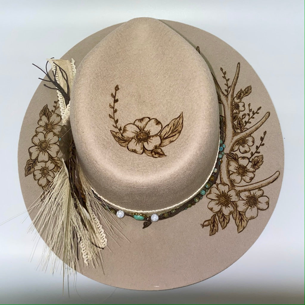This custom burned hat was a live auction item at a ladies night event. It is a short brimmed rancher style wool felt hat featuring an elk antler with buttercup style flowers.