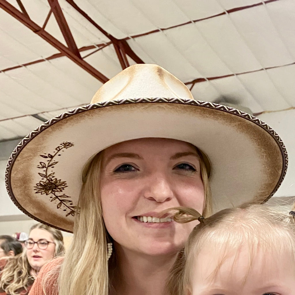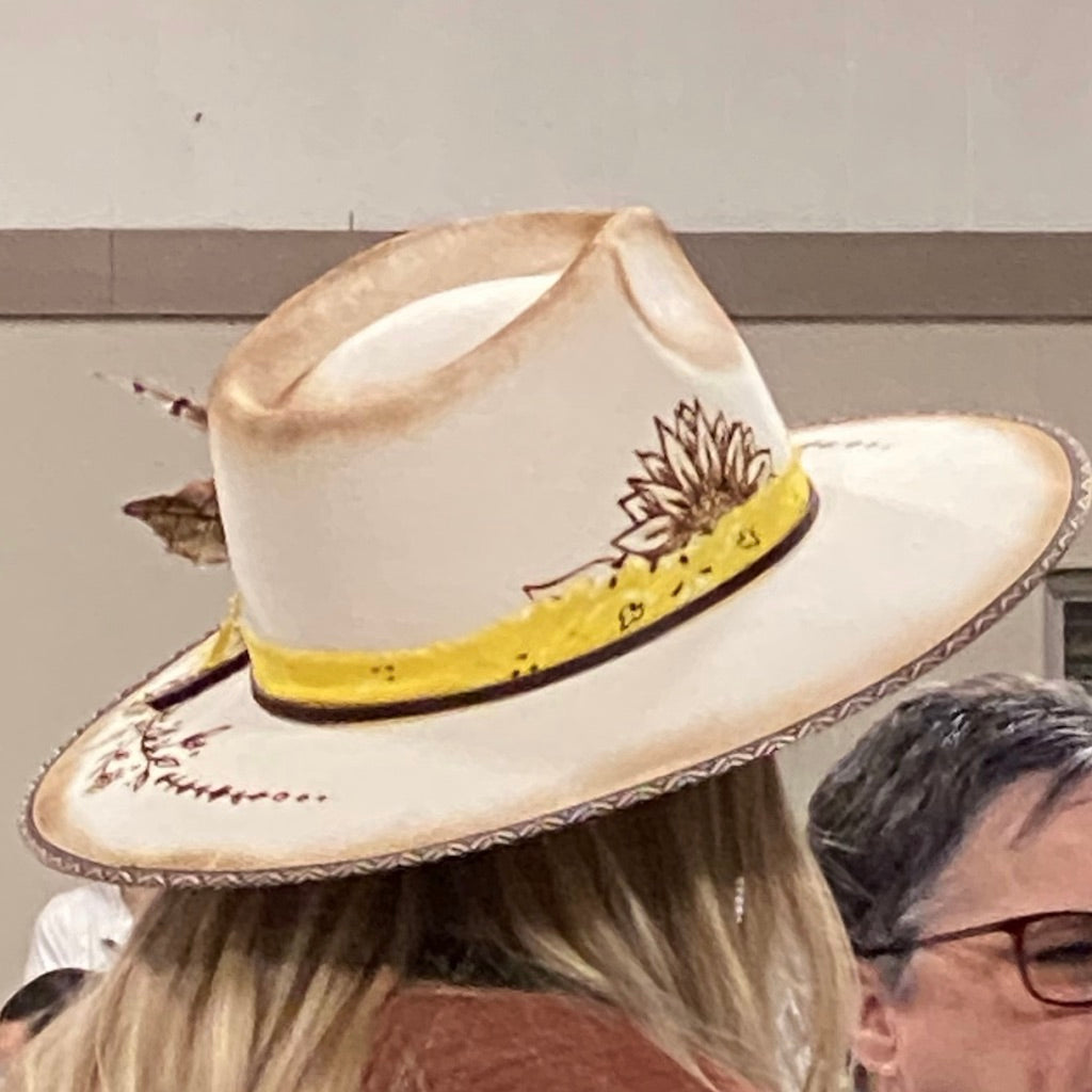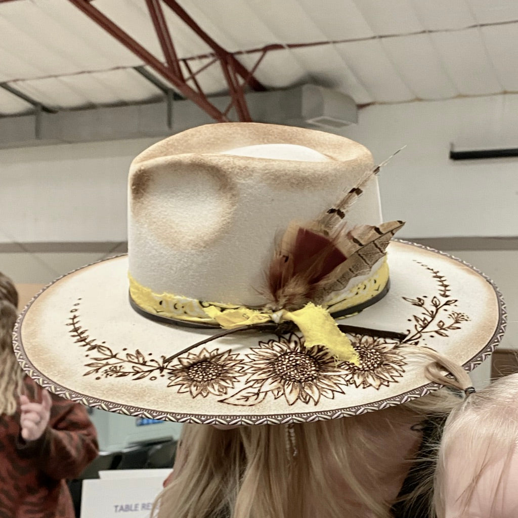 This custom burned hat was a live auction item at the Thermopolis event. This tan colored rancher style wool felt hat features sunflowers and burned edging! What really sets this hat apart is the metallic geometric edging around the brim of the hat!