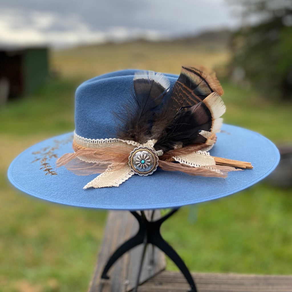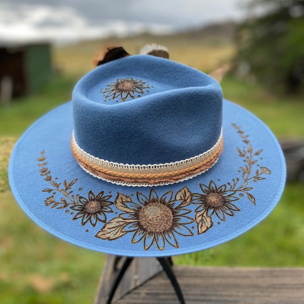 Beautiful hand burned sunflowers on this dusty denim blue rancher style wool felt hat. This hat also has a luxurious satin lining. Hat features an adjustable sweatband so one size fits most.