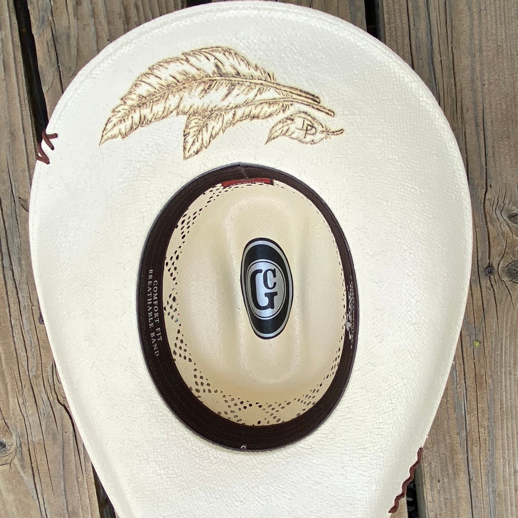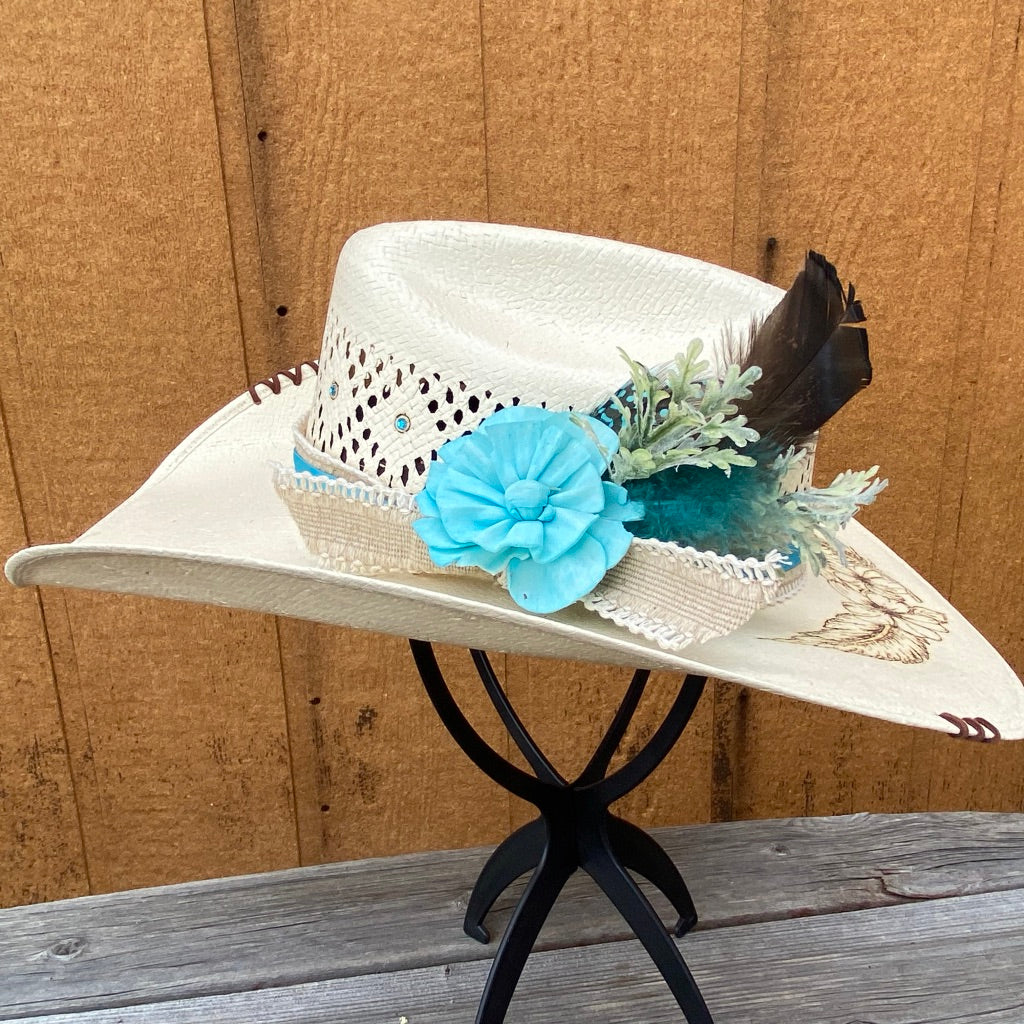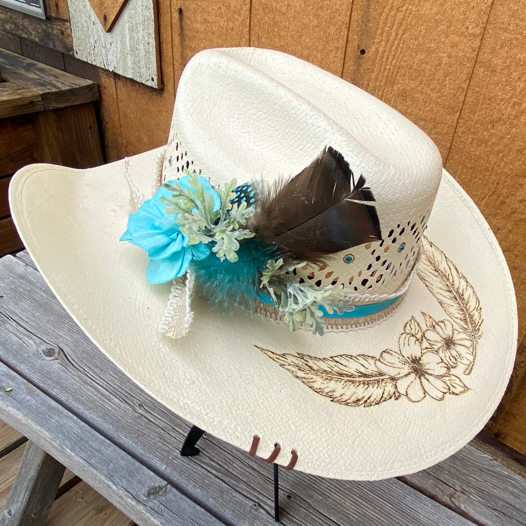 These unique hats are designed and hand burned by Cowgirl Spirit Creations. Hat band, feathers and any embellishments pictured are included. Feathers may be taken out for shipping purposes but can be secured by customer upon arrival. Hats are sealed twice to protect design and give some moisture protection. Air out hat upon arrival as it may still have a slight odor.