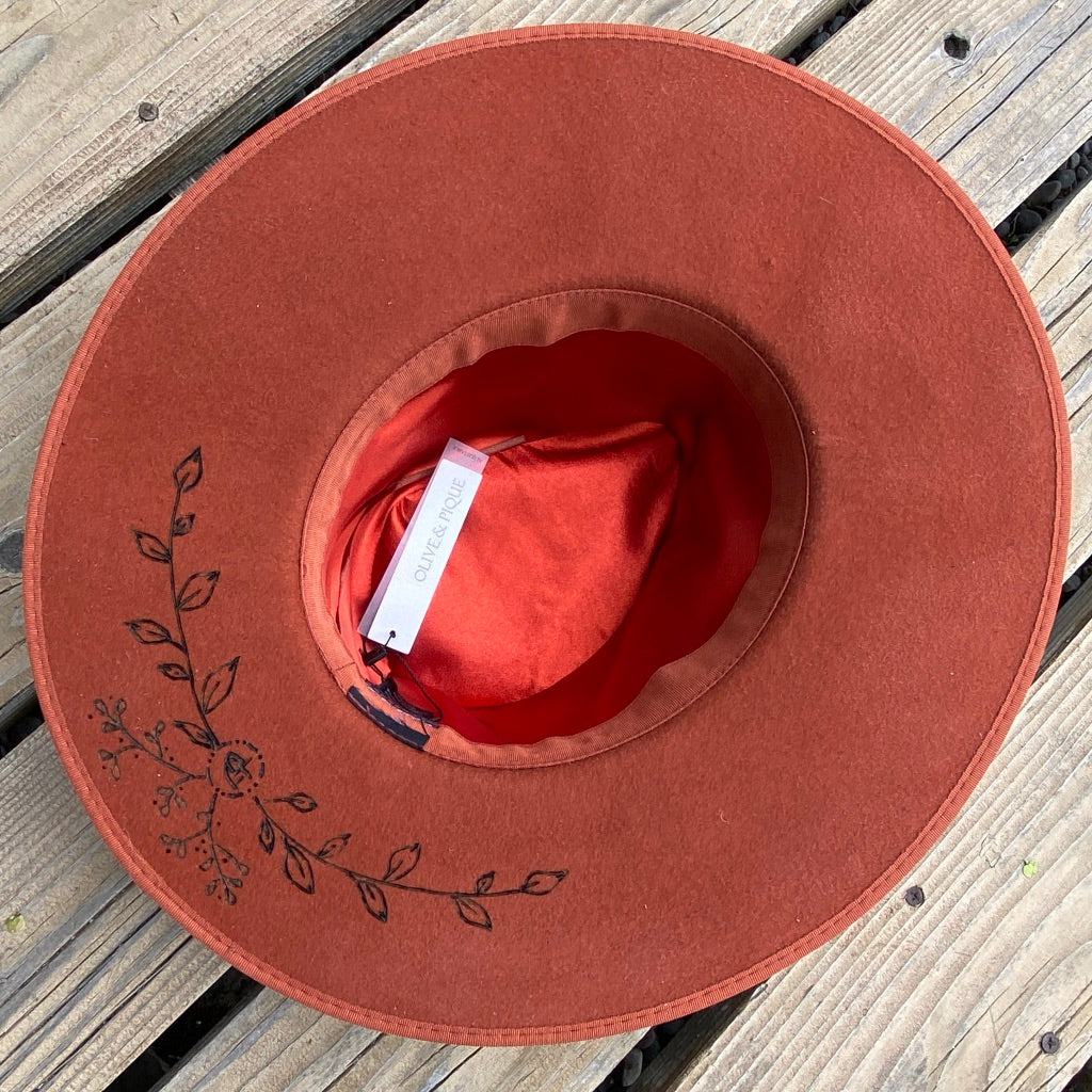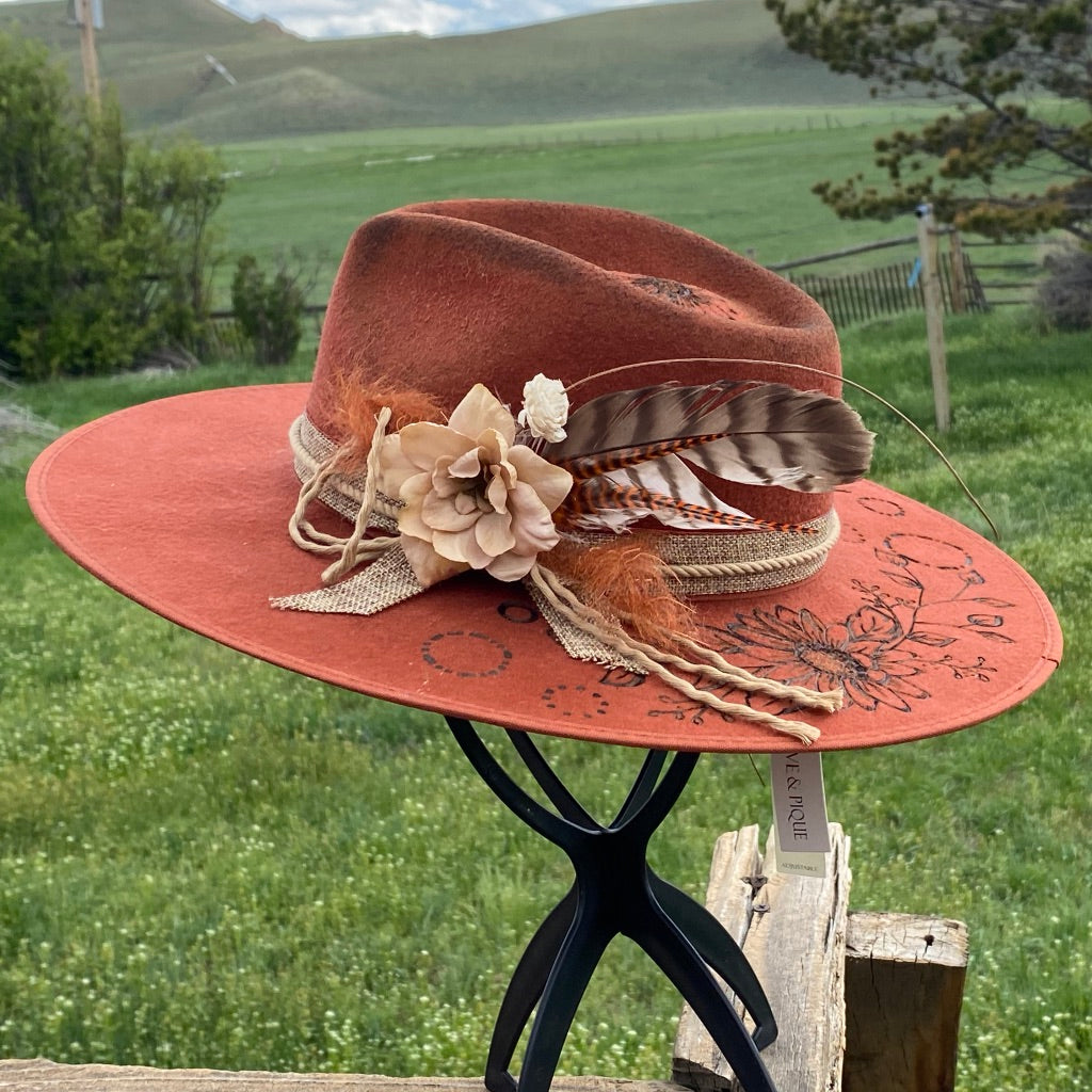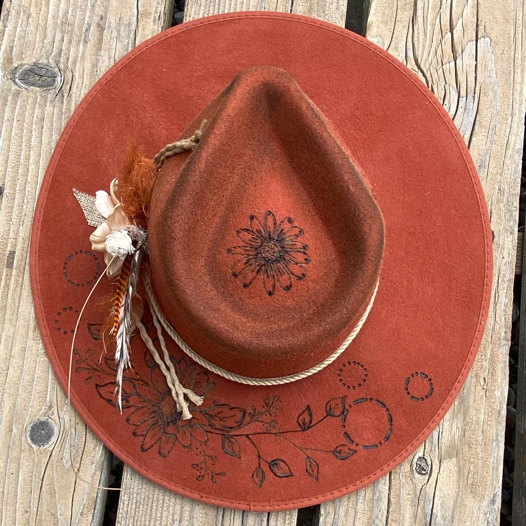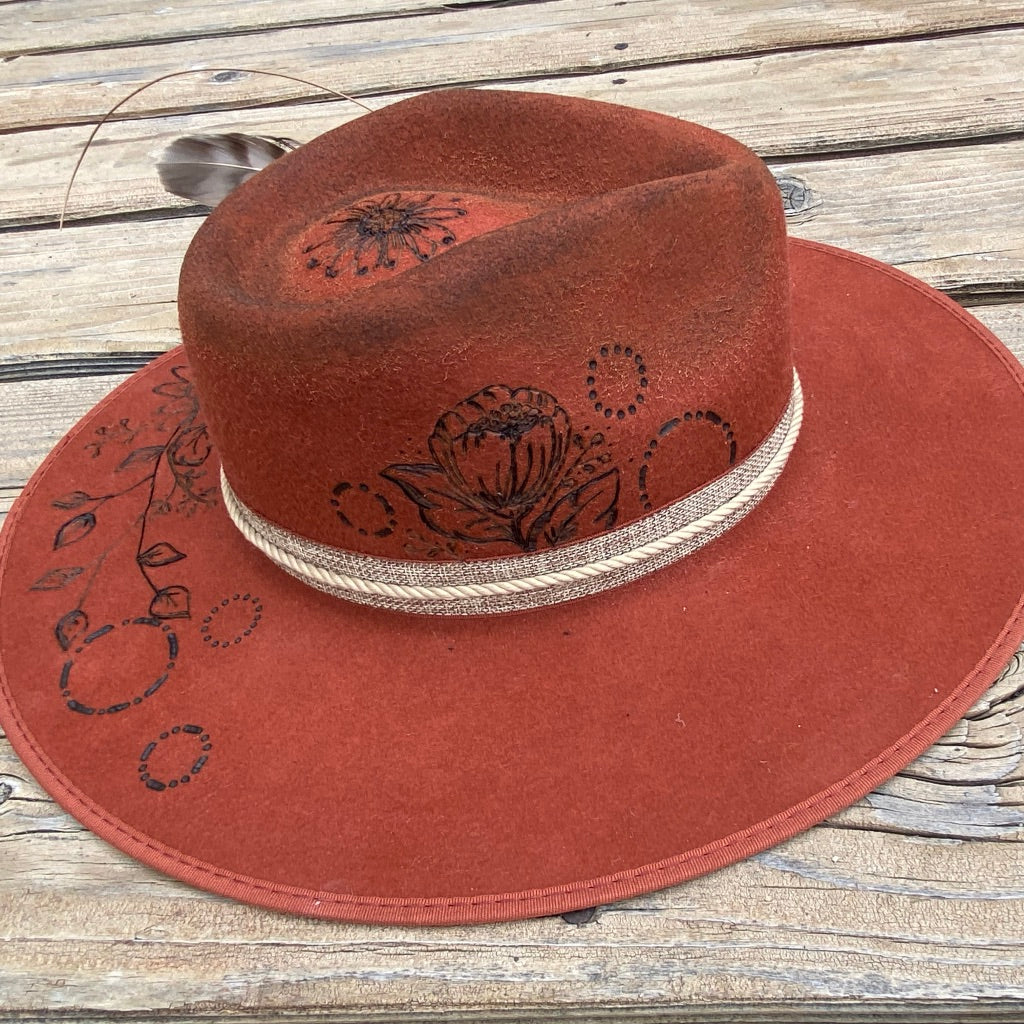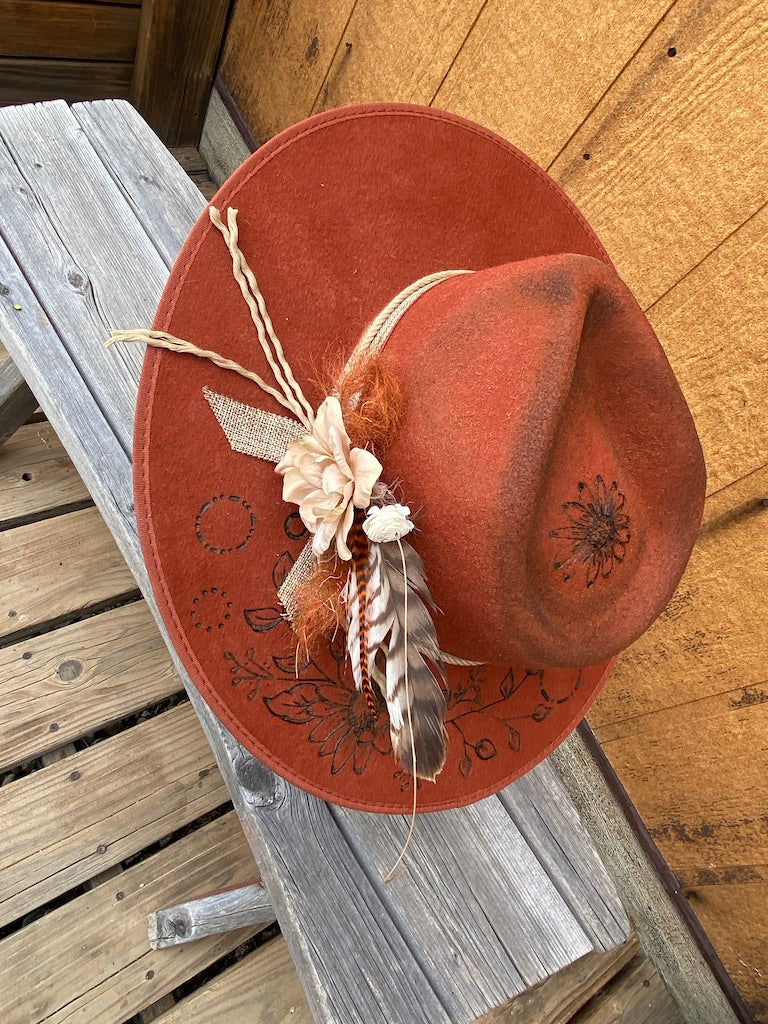 This rust colored rancher style wool felt hat features hand burned daisies, abstracts and other florals. Whether it's for a Fall roundup or a Harvest Moon dance this hat just begs to be worn! This hat also has a luxurious satin lining. Hat features an adjustable sweatband so one size fits most.