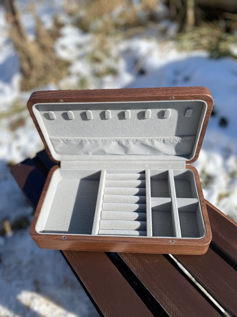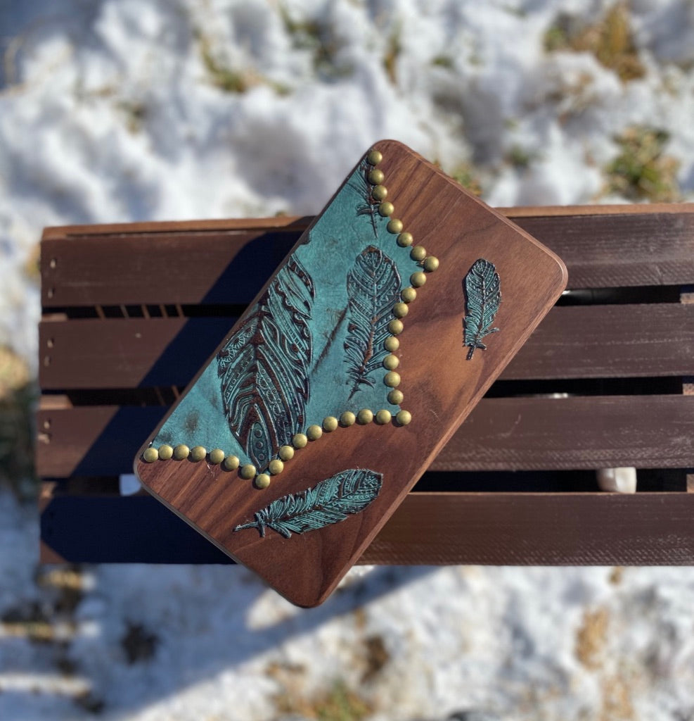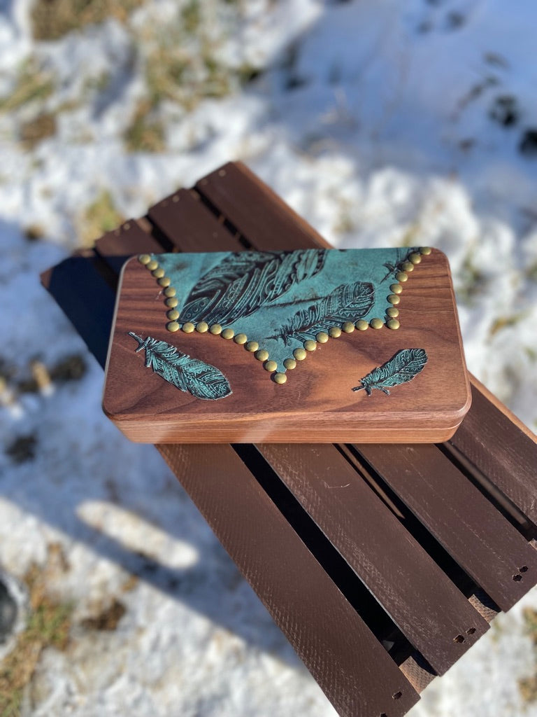 One of a kind walnut jewelry box. This beautiful organizer features antiqued turquoise feather patterned leather fashionably attached with antique nail heads with two individual leather feathers attached as well. The spacious interior of the box can be used to store and display jewelry necklaces, bracelets, watches, earrings, ear studs, hairpins, cufflinks, brooches and more. 10in. x 5.59in. x 2.20in.